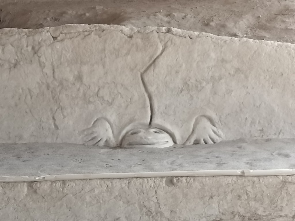 Como nos cuenta la arqueóloga Tatiana Abad, jefe de sitio, el edificio que alberga estos relieves iba a ser demolido para dar paso a la construcción de un parque, pero felizmente fue descubierto a tiempo y es así que hoy podemos ser testigos de un salón ceremonial que nos presenta dos escenas de relieves murales. En la parte inferior se observan unas figuras antropomorfas con los ojos cerrados y quizá en estado de desnutrición o hambre porque presentan sus costillas expuestas, mientras que los relieves de la parte superior parecen representar niños en diferentes posturas como si estuviesen realizando una danza.