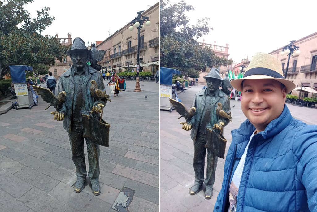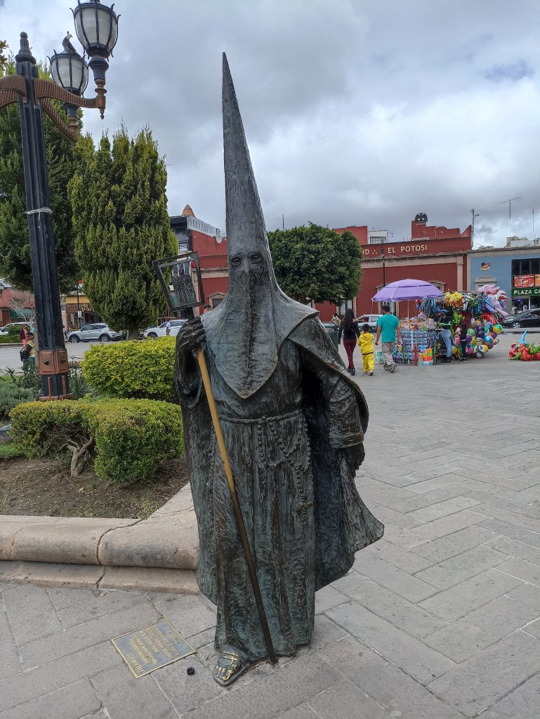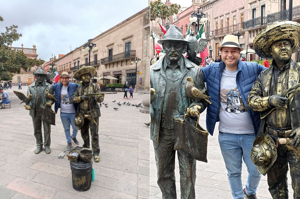 Si seguimos recorriendo los alrededores, es probable que nos topemos también con estatuas de carne y hueso, tal como me pasó cuando regresaba al Palacio Municipal. Justo al lado del Señor de las Palomas, tuve el gusto de encontrarme con un artista callejero que representaba a un revolucionario mexicano muy bien personificado con su sombrero y escopeta. Definitivamente, un personaje como muchos potosinos que dan vida y encanto a esta bella ciudad.