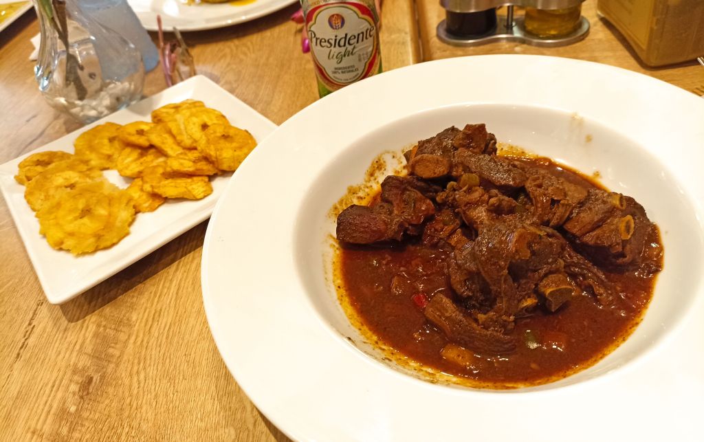 Una vez que revisé la carta, mis ojos apuntaron a la sección El Sabor Dominicano. Opté por pedir un chivo guisado y, como guarnición, ordené unos tostones o fritos verdes que vienen a ser rodajas de plátano frito. Finalmente, para beber, qué mejor que una cerveza Presidente para calmar la sed ante los 31 grados de calor que nos abrazaba aquella tarde.
