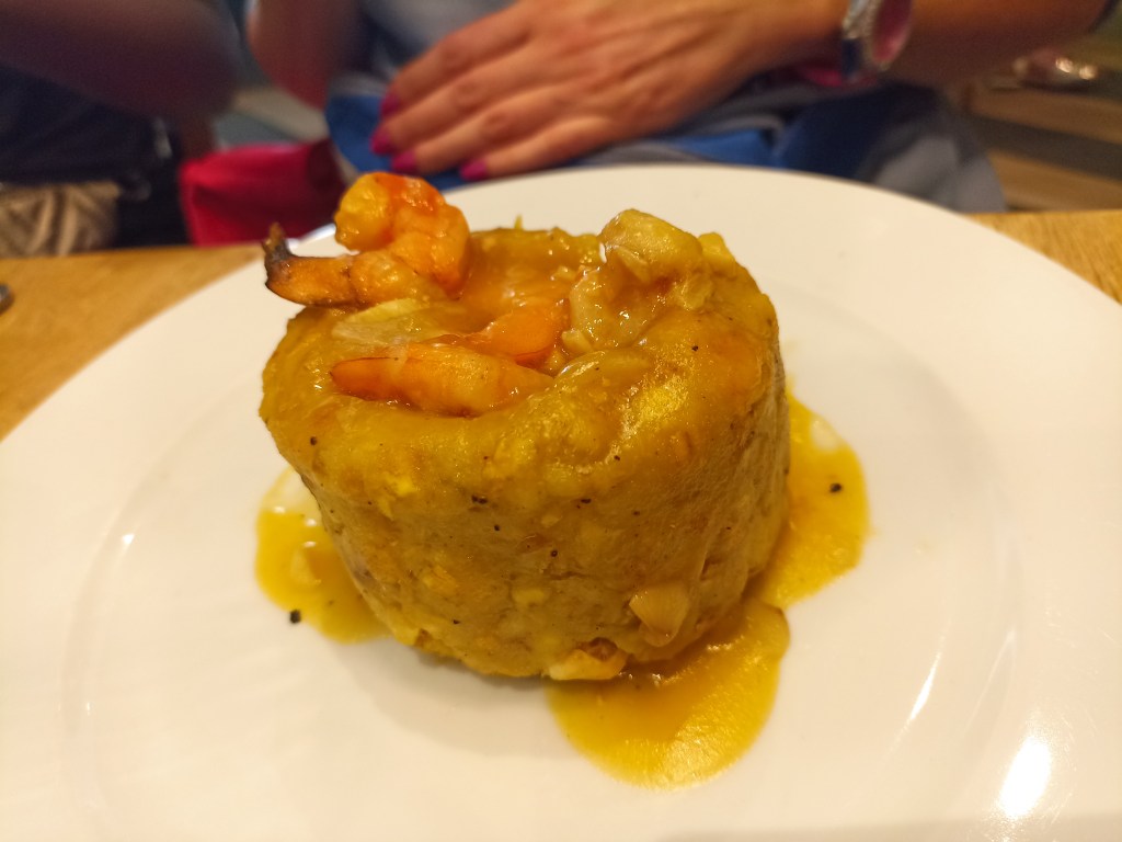 Otro plato que despertó mi interés fue el mofongo de camarones que pidió mi amiga Luisa. Con la confianza que ya le tenía a esta querida amiga colombiana, me atreví a pedirle que me dejara darle una probadita y en verdad debo decir que fue una delicia saborearlo. Se trata de plátanos fritos que contienen camarones en una salsa a base de vino blanco y ajo. «La salsa de los camarones la hacen abundante y hacen un hueco en el medio de los plátanos machacados para poner la salsa y alrededor poner los camarones», nos especificó Wendy.