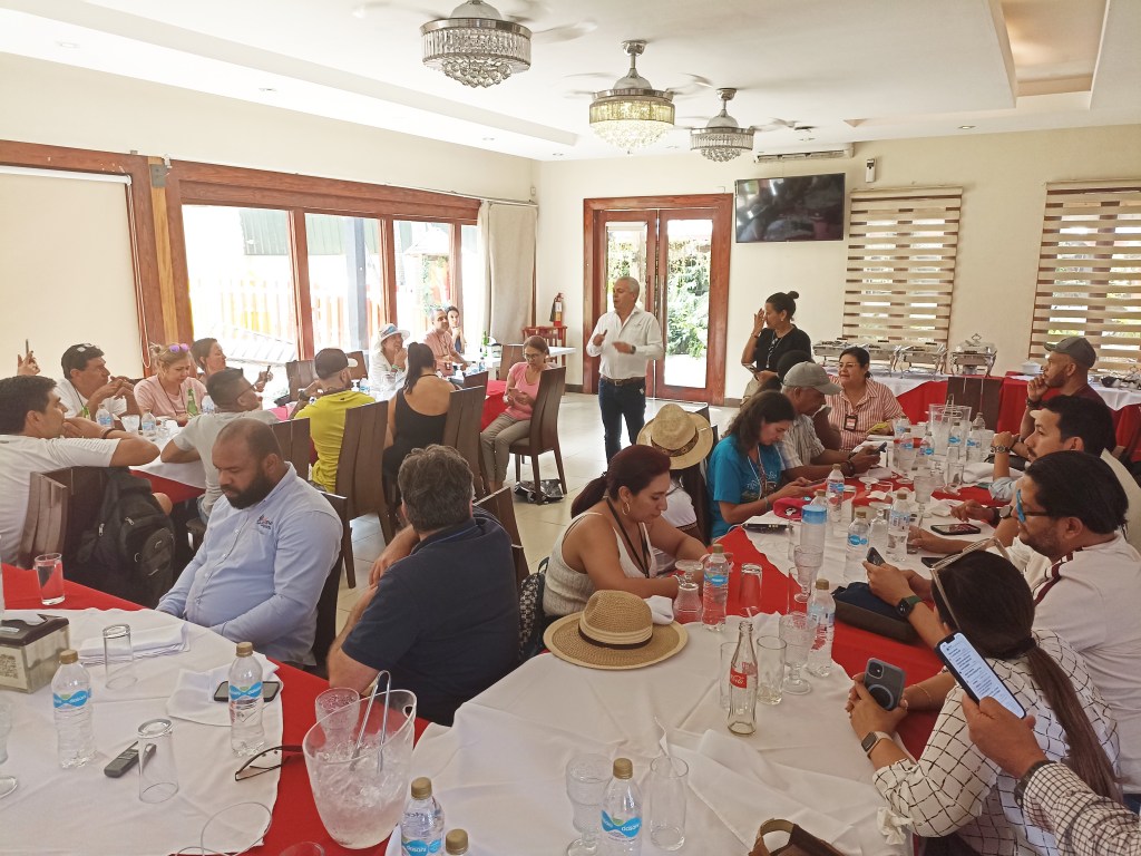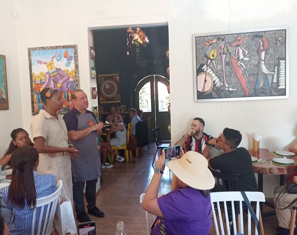 Su chef, Leandro Díaz, cocinero dominicano Marca País nos recibió y nos brindó una degustación de algunos de sus platos urbanos, entre ellos catavías, flores de plátano, sancocho dominicano, pescado frito al estilo Boca Chica (playa cercana a Santo Domingo donde se estila freír el pescado acompañándolo de morito), el barrigón (chicharrón horneado) y, como postre, un pudín de pan con casquillo de guayaba y licor de guavaberry.